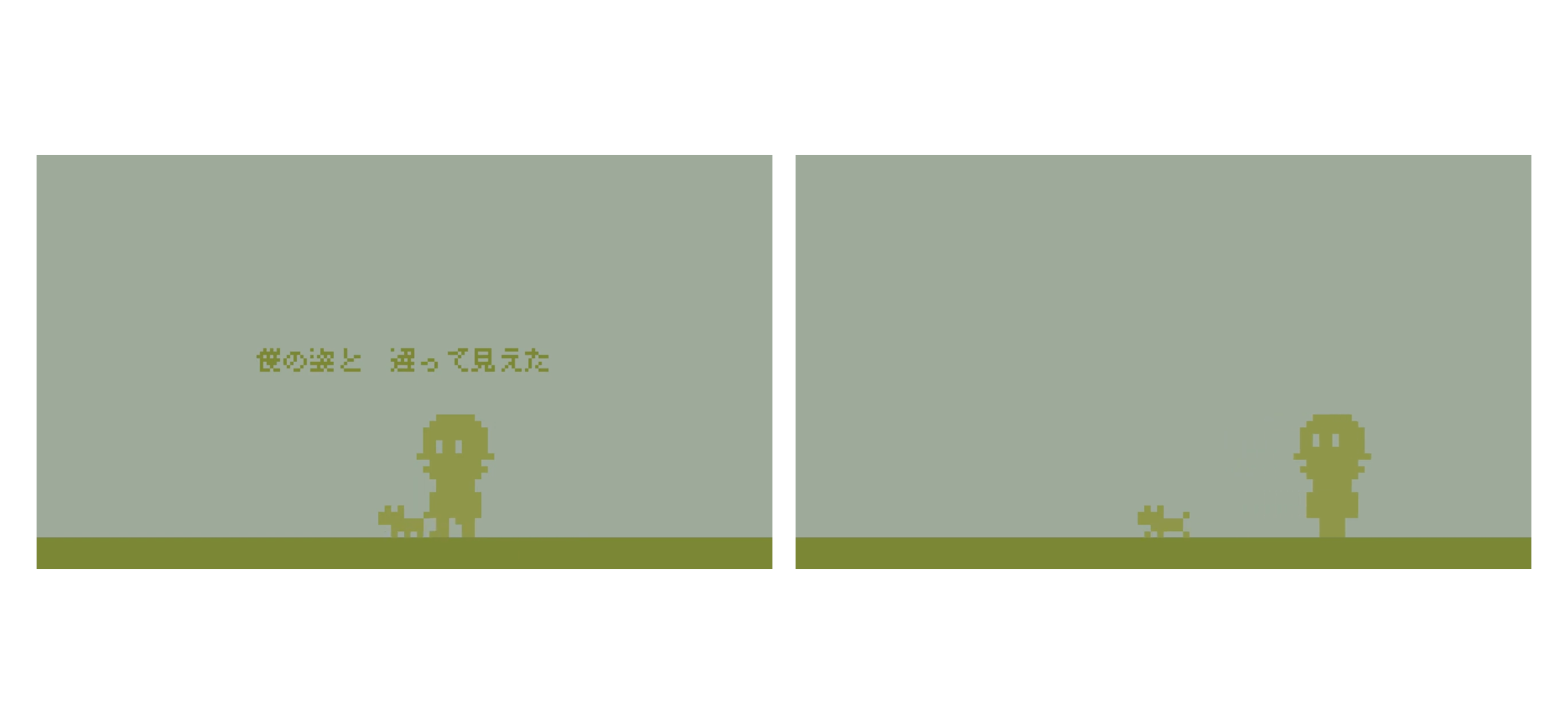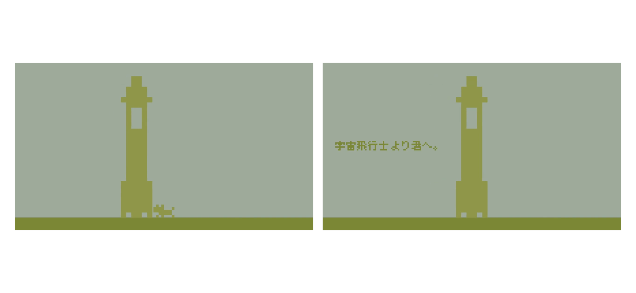 GB風の色合いで犬が宇宙へ行くところを表現した。